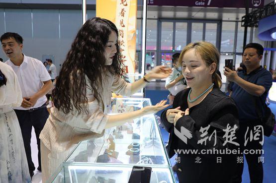 深圳游客在2025年文博会上购买绿松石。图片提供:通讯员